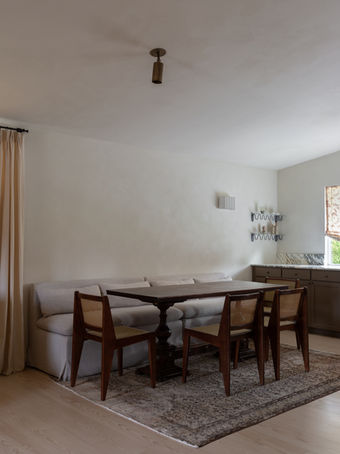 The dining room features one of my favorite vintage finds, the dark stained oak table that reminded me of touring castles in Romania. A vintage rug from Yet Lovely grounds the space and Crate and Barrel Belmar slipcover banquette for those of us who prefer to eat crisscross apple sauce.