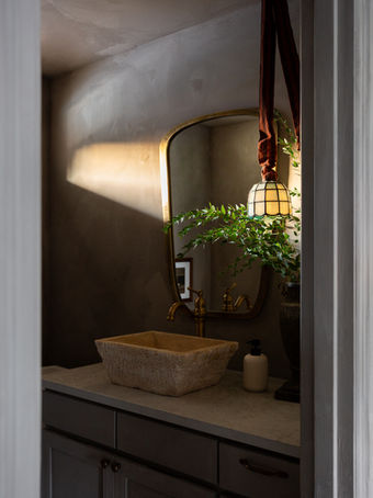 The entertainment room and powder bath received moody limewash on every surface, designed to mimic thunderstorms. The quote “I sat with my anger until she told me her name was grief” comes to mind when I sit here. With turmoil leading the emotion and creating such we knew we knew we needed an extremely large sofa. We sourced ours from Crate and Barrel and it's still the best seat in the house. The vintage glass pendant in the powder bath, cast a rainbow effect on the moody walls, portraying a glimpse of hope we were craving.