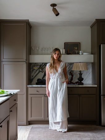 Our first priority in the kitchen was to rotate the space to focus on the rolling green hills of the backyard. The cabinets received Broccoli Brown by Farrow and Ball for its ability to "feel reserved and comforting" and to mimic moss growing alongside a river. As soon as I read that description, I could hear the river trickling over the stones, moss under my feet and the sun peeking through the trees which gave me an immediate return to my childhood. This color sets the tone for the entire home, grounding everything around it. We added extra honed Statuario marble, custom roman shades fabricated by Dream House Interiors and sourced through The Expert. Our favorite little corner features the Nara Scallop shelves, a custom design of wrought iron and glass, designed and sold on our site.