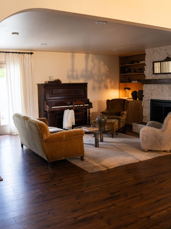 Project Murano was designed with romance as its leading character. As you step inside the formal living space, you feel as if you have entered the greenest forest and sun rays are peaking through the tall trees. The large stone fireplace was brought back to life through the use of Farrow and Ball paint in color Dimity, and wrapped in custom floor to ceiling built ins that show off the beautifully aged unlacquered brass hardware. Set as its counterpart, the vintage bookshelf across the room, was given velvet wallpaper sourced from none other then Morris and Co.