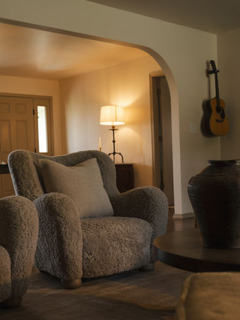 The formal sitting room was organically split in two, to allow for intimate conversations and cozy seating through the use of a vintage mohair sofa, shearling accent chairs (Crate and Barrel by Athena Caldrone) and a custom made coffee table. Following the earth tones of the formal sitting room, we decided to head deeper into the forest by turning up the moodiness of the primary suite. We chose to color drench this room in London Stone by Farrow and Ball and matching wall to wall carpet. The room is set ablaze with custom upholstery in the bay window and wrapped in Italian linen drapes by Dream House Interiors. The closets received reclaimed wood doors sourced from a 150 year old barn. We added sweet moments of vintage decor and plaster sconces to keep the room feeling light and playful.